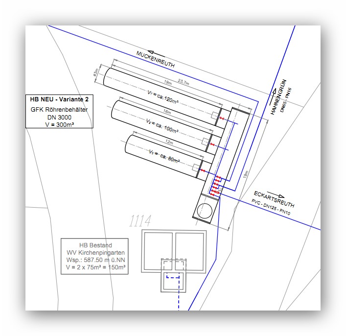 Der bestehende Hochbehälter wurde in den fünfziger Jahren des letzten Jahrhunderts errichtet und erfüllt weder qualitativ noch quantitativ die aktuellen Anforderungen zur Wasserversorgung der Gemeinde Kirchenpingarten.